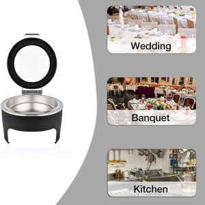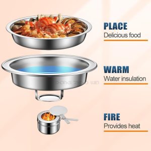 - Optimized Design – Round chafing dishes can distribute the heat more evenly. Thickened material, highly-polished mirror finish , gold accented handles and legs create a textured metal sense, elegantly display catering food straight from the oven onto the buffet table. Perfect for home, restaurant or hotel commercial use.