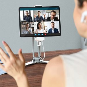 It features a 360-degree rotating holder, plus multiple pivoting and rotating joints. Quick release buttons allow for easy tablet removal from the resizable holder, and the stand folds compact for easy storage when not in use.